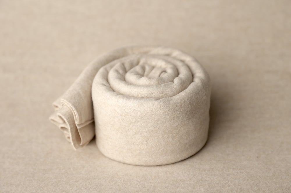 Super soft reversible solid knit in oatmeal beige color. One side has a brushed fuzzy feel and the other smooth jersey texture.